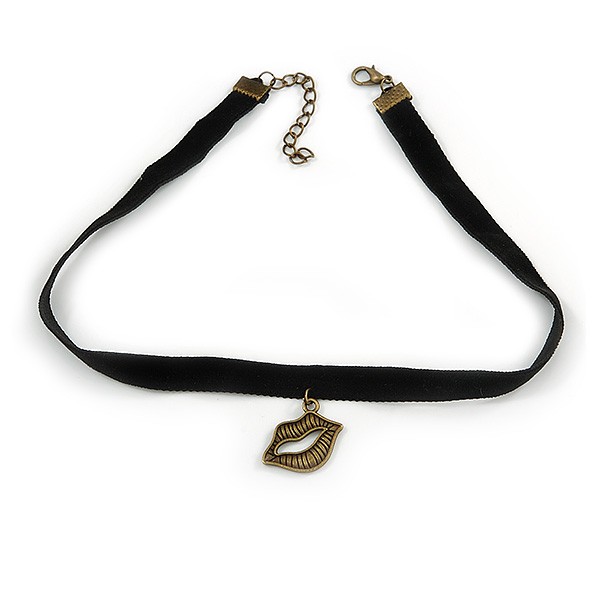 Black Velour Choker Necklace with Bronze Tone Lips Pendant - 34cm L/ 4cm Ext