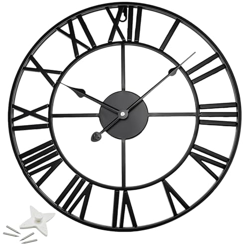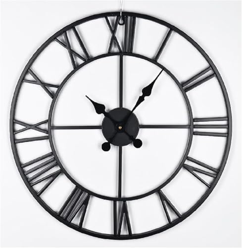 Black Metal Wall Clock for Garden, Large Wall Clocks for Living Room, Silent Non-Ticking Roman Numerals Wall Clock for Indoor & Outdoor, Vintage Look Clock for Bedroom, and Kitchen – Large 60 cm