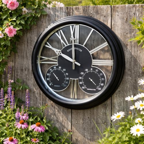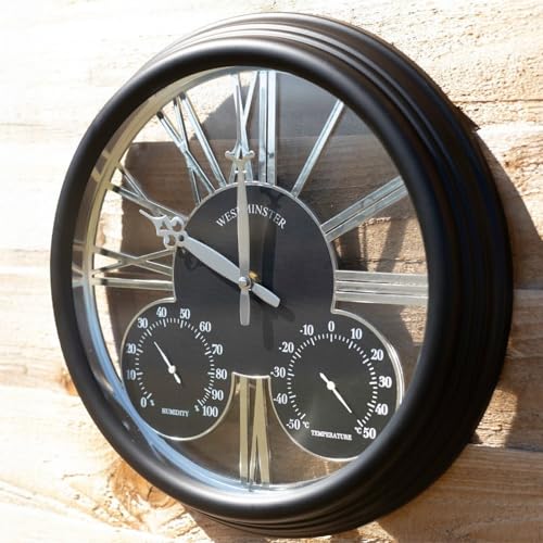 Homezone Large Battery Operated Garden Clock - 40cm Weatherproof Black Wall Clock with Thermometer & Barometer - Quartz Indoor Outdoor Weather Station for Gardens & Wall Decoration for Living Room