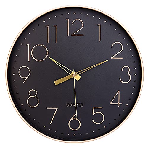 Topkey Black Wall Clock 12" Silent Non Ticking Arabic Numeral Clock Round Decorative Wall Clock for Living Room, Bedroom, Kitchen (Battery Not Included) Gold Numbers