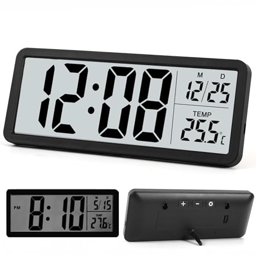 Venchin Digital Wall Clock: Black Wall Clocks Battery Operated, Temperature, 12/24HR, LCD Digital Clocks for Living Room, Bedroom, Office, 20CM Modern Table Clock Room Decor