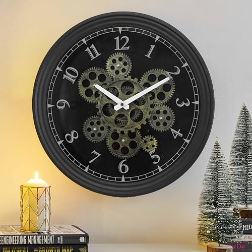 CLXEAST 15 Inch Real Moving Gear Wall Clock, Vintage Industrial Steampunk Aesthetics Art Home Decor Clock, Small Modern Classic Metal Black Gold Wall Clock for Living Room Decor,Kitchen, Office