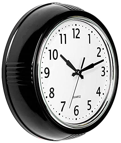 Bernhard Products Black Wall Clock Retro Silent Non Ticking 9.5 Inch Round Battery Operated Quality Quartz Easy to Read for Home Kitchen Office Classroom School Clocks Sweep Movement Vintage Décor