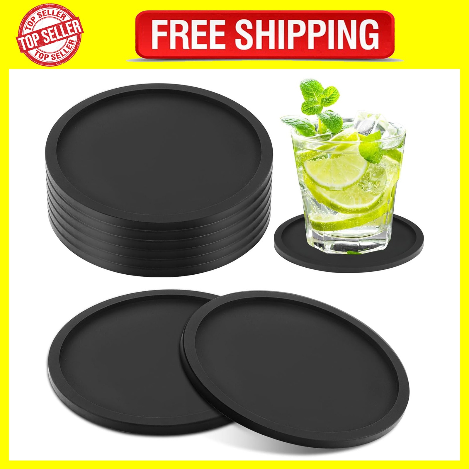 2X(Silicone Black Drink Coasters Set of 8 Non-slip Round Soft Sleek and 3612