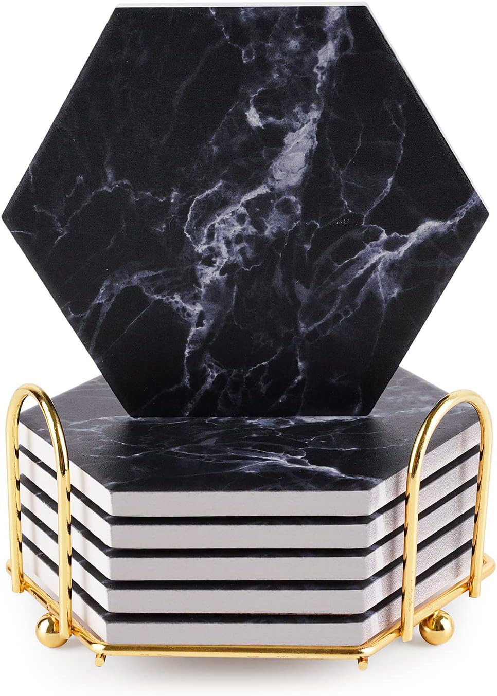 6 Pcs Cool Black Marble Coasters With Holder - Hexagon Absorbent Modern Ceramic Set - Best Stone Drink Coasters for Beverage, Coffee Table, Cup, Bar