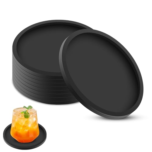 BOENFU Coasters Set of 12 Silicone Drinks Coasters with Holder Beer Mats Heat Resistant, Non-Slip, Round Black Drinks Coasters for Home, Office, Bars, 10cm