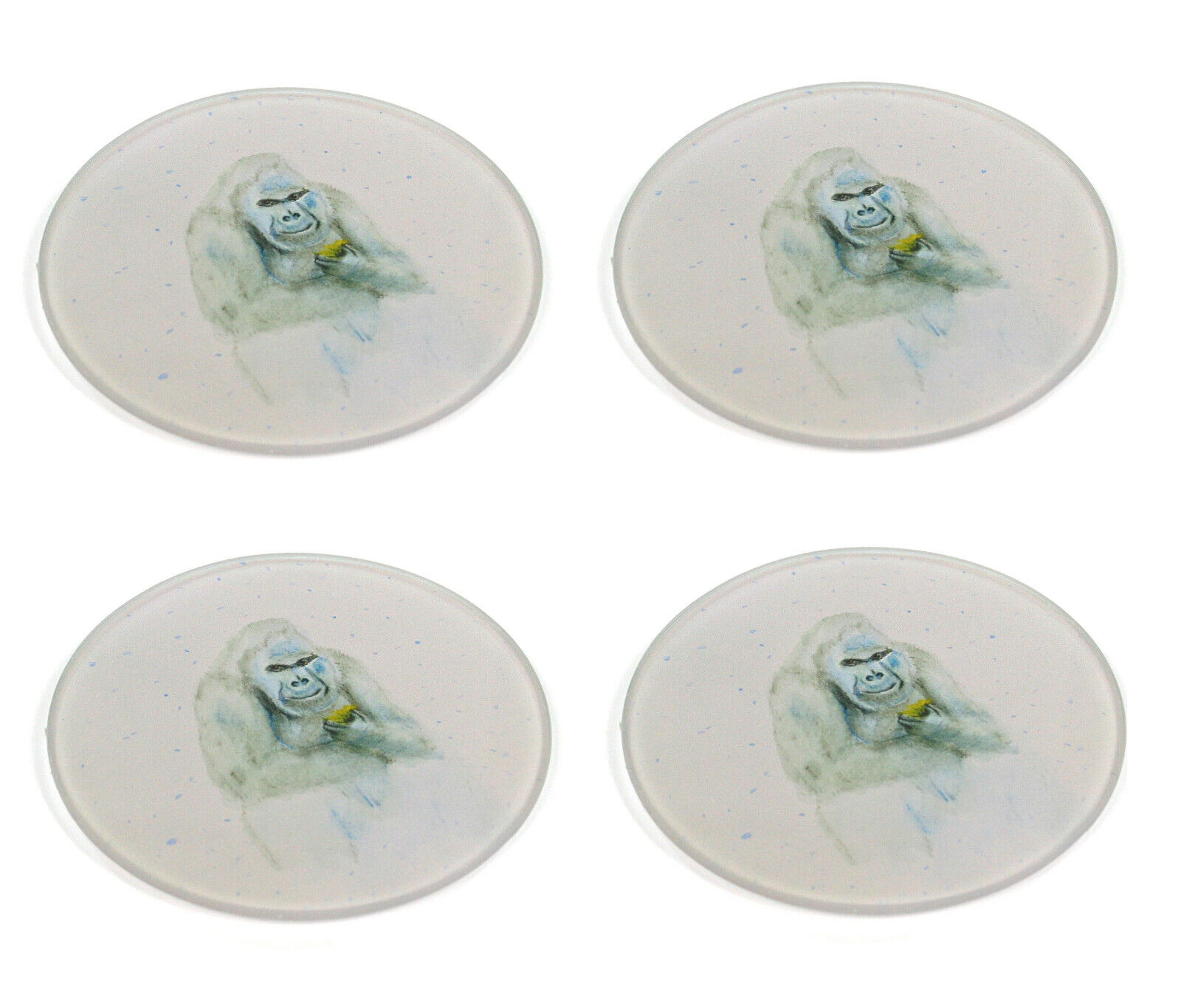 Set of 4 Glass Coasters Black Ginger Gorilla Animal Round Tea Coffee Kat Jackson