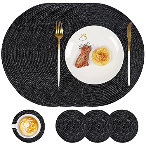famibay Placemats and Coasters Set of 4 Round Woven Placemats Washable Heat Resistant Place Mats Round Table Mats and Coasters Black for Kitchen Dining Table