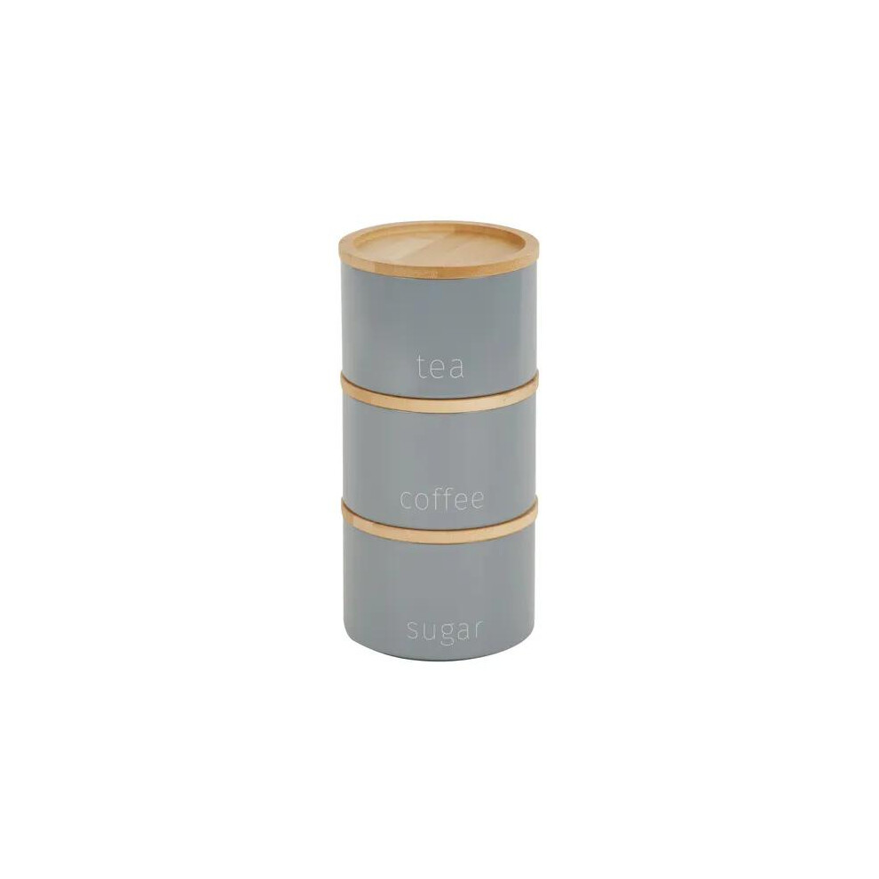(Grey) Stackable Kitchen Storage Canisters, Black 3pk Tea, Coffee, Sugar Metal Stacking Canisters Tins, Matte Finish and Wooden Airtight Lids