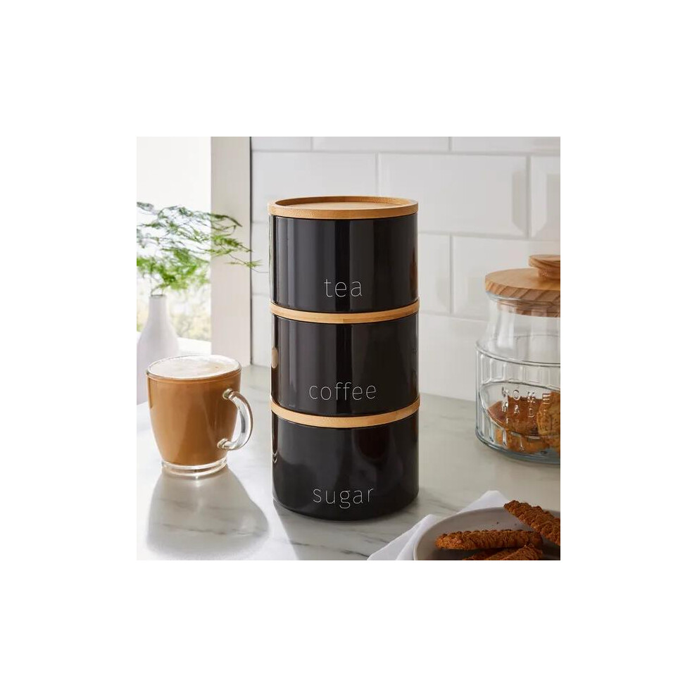 Harbour Housewares Stackable Tea Coffee Sugar Canisters with Bamboo Lids - Black - Stacking 3pc Tea Coffee and Sugar Canisters Set Airtight Kitchen Organiser Food Storage Jars