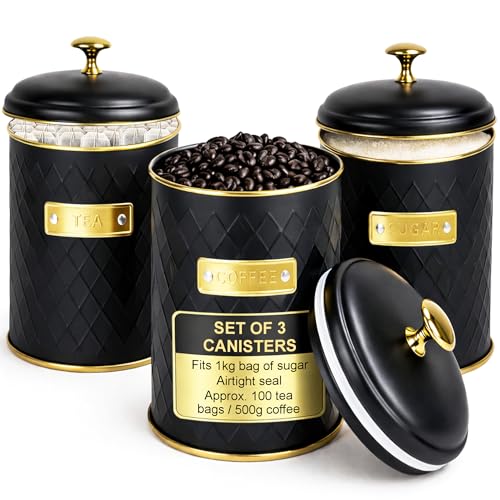Callisto Black Tea, Coffee and Sugar Canisters Set for the Kitchen/Secure Lids f