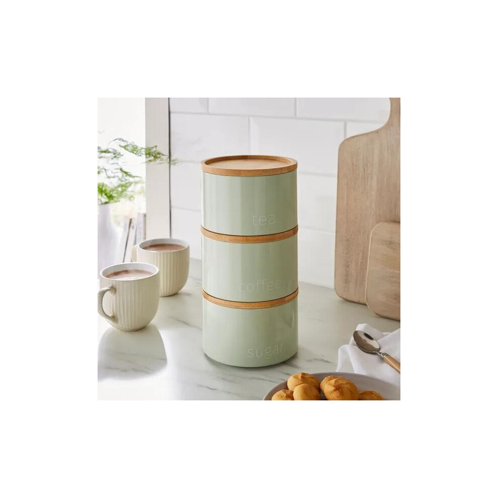 (Sage) Stackable Kitchen Storage Canisters, Black 3pk Tea, Coffee, Sugar Metal Stacking Canisters Tins, Matte Finish and Wooden Airtight Lids