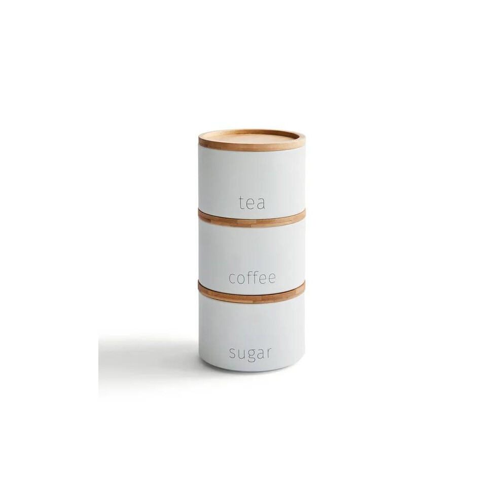 (White) Stackable Kitchen Storage Canisters, Black 3pk Tea, Coffee, Sugar Metal Stacking Canisters Tins, Matte Finish and Wooden Airtight Lids