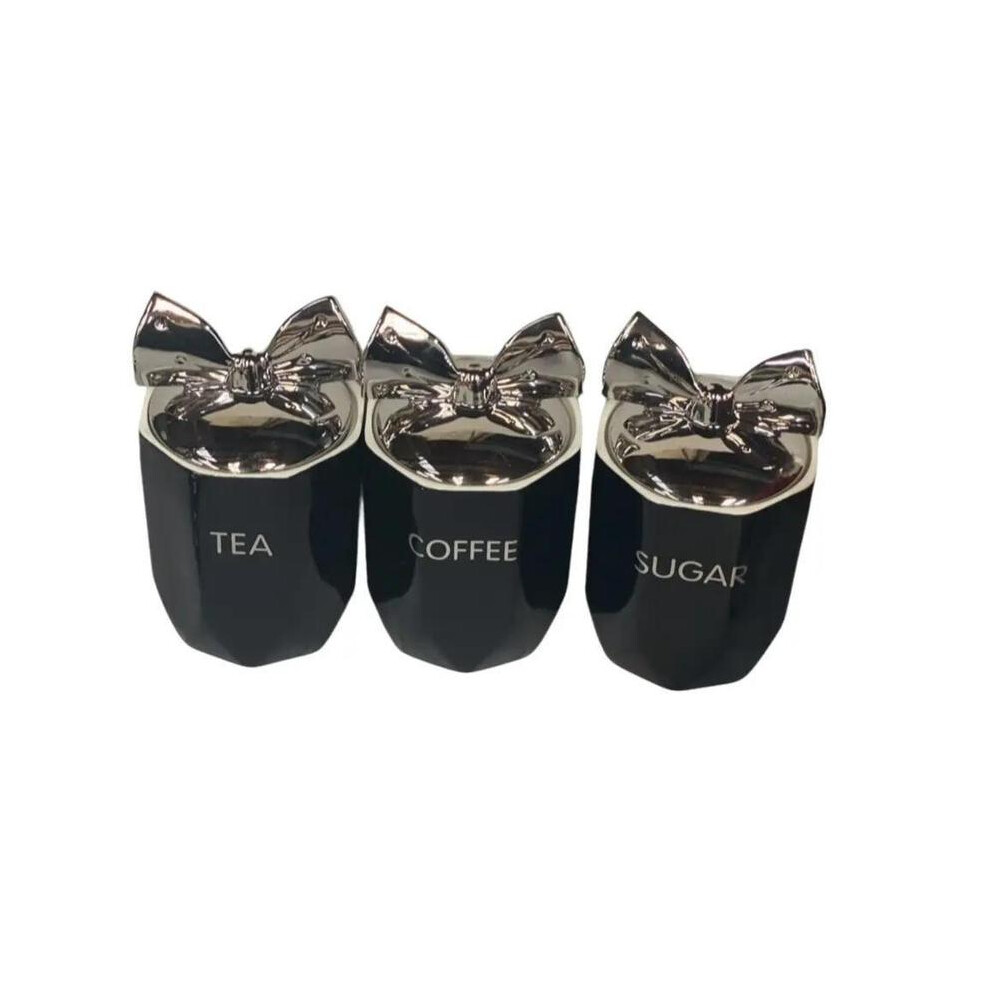 (Black) 3 Piece Elegant Ceramic Tea, Coffee, and Sugar Storage Jars with Silver Bow Lid â Stylish Kitchen Canisters