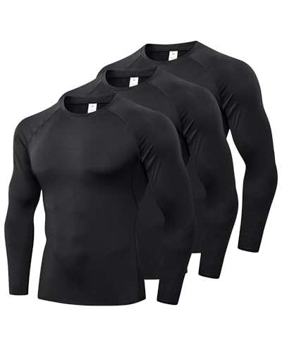 Yuerlian Black 3 Pack Compression Shirt for Men Long Sleeve Athletic Gym Undershirts Cool Dry Breathable Top Sports Running Workout Football Tee Shirts