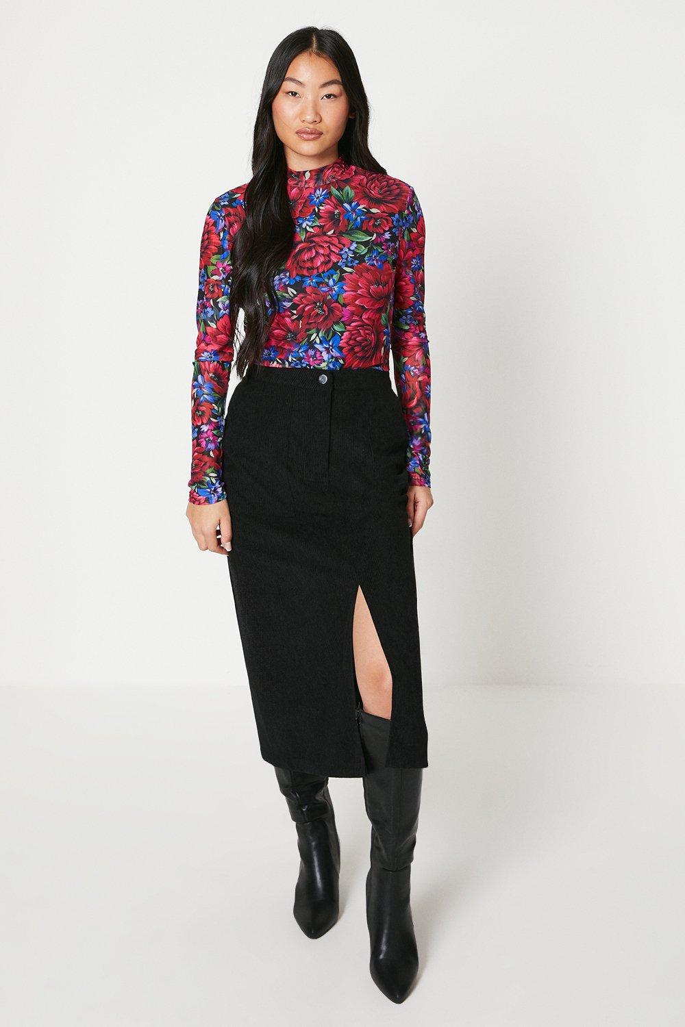 Petite Cord Split Front Midi Skirt