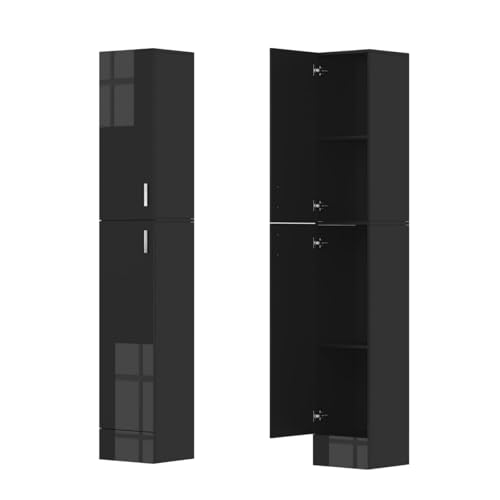 Kitchen Tall Cupboard, Narrow Floor Stand Cupboard Organizer, High Gloss Wood Slim Storage Unit with 2 Doors 4 Shelves, Tallboy Corner Shelving Cabinet for Living Room Bedroom Bathroom Office, Black