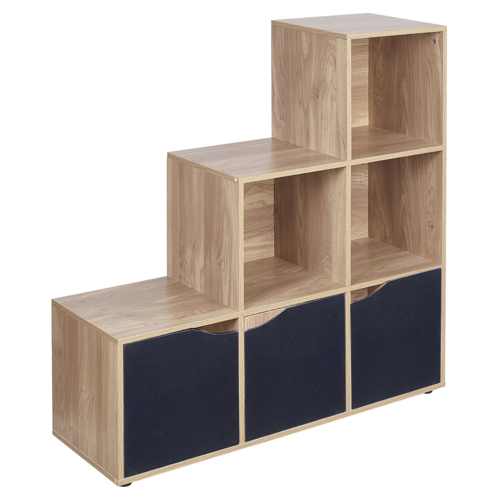 (Oak, Black) 6 Cube Step Storage Bookcase Shelf Unit Doors Wood