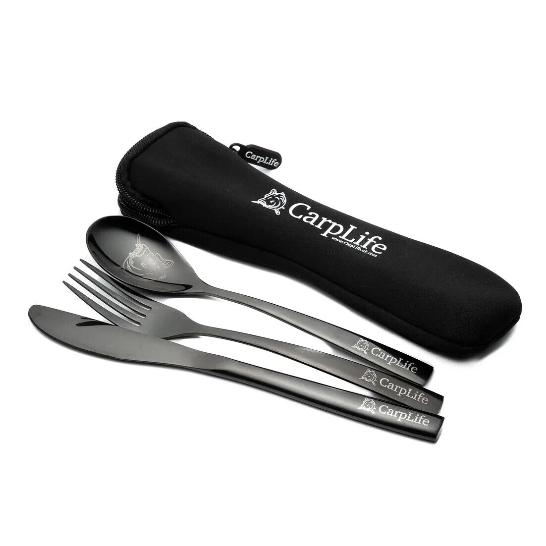 CarpLife Luxury Camping Dining Set - Fishing Plate Set for one - Carp Fishing Dinner Set - Fishing Plate and Cutlery Set - Microfibre Hand Towel - Black Fishing Cutlery