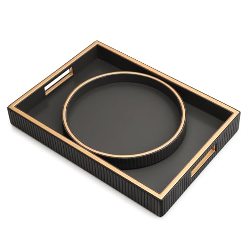 SANZIE Leather Tray Desktop Storage Organizer Premium Serving Tray Decorative Tray Valet fit for Sundries Cosmetics Phone Wallet Cutlery (Black Holder with Disc)
