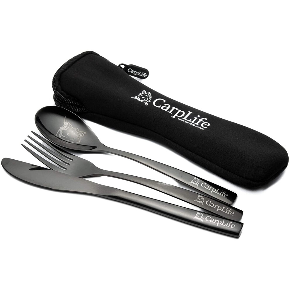 CarpLife Cutlery Set - Fishing Cutlery Set - Carp Fishing - Black Stainless Steel Cutlery Set - Etched Carp Fishing Cutlery Set