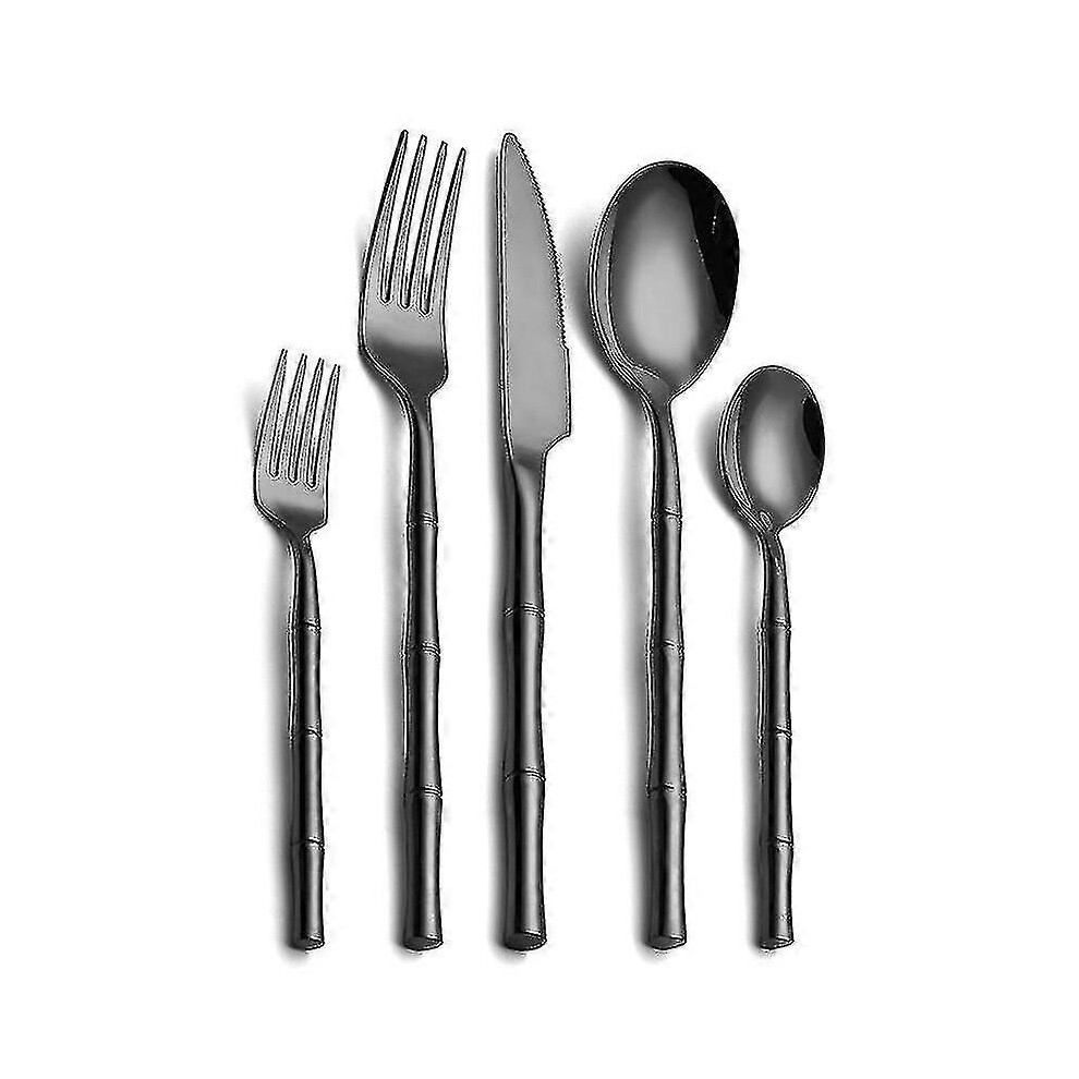 (Black) Stainless Steel Cutlery, Creative Cylindrical Bamboo Handle, 304 Thick Cutlery (5-piece Set)