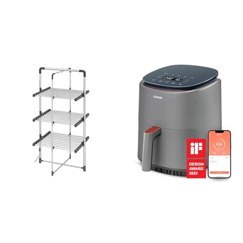 Black+Decker 63099 3-Tier Heated Clothes Airer Aluminium, Cool Grey, 140cm x 73cm x 68cm & COSORI Air Fryer Lite 3.8L, 75-230℃, Amazon Exclusive, 7 Cooking Functions, Smart Control, 1500W