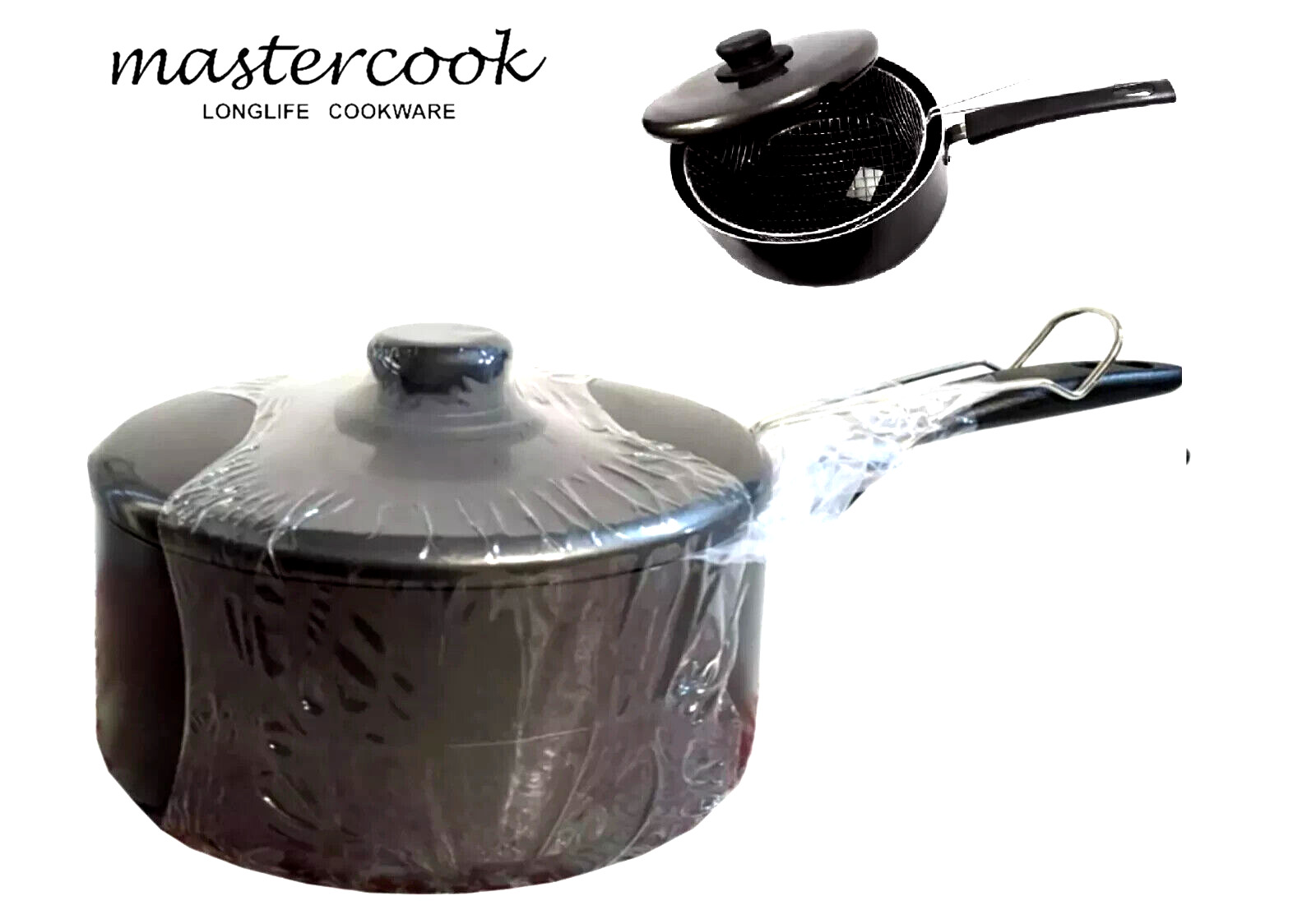 BLACK NON STICK CHIP PAN SET FRYER DEEP FAT FRYING BASKET POT W GLASS LID 2 LTR