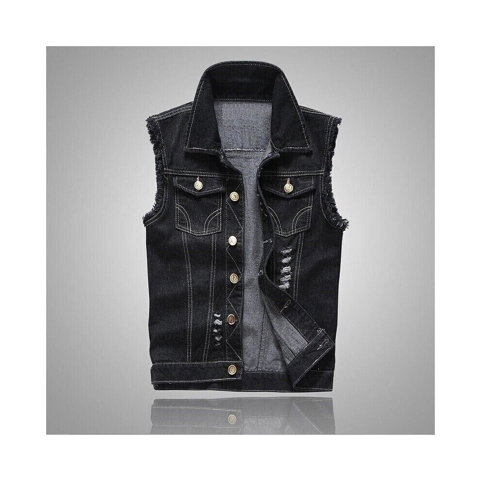 (Black, Tag Asia L=UK XS) Mens Ripped Denim Vest Sleeveless Trucker Biker Jeans Jacket Waistcoat Gilet