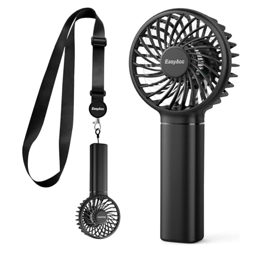 EasyAcc Mini Handheld Fan, Powerful Desk Fan 3000mAh Up to 15Hours with Lanyard & Detachable Base 3 Speed USB C Rechargeable Portable Fan Quiet Personal Pocket for Kids Girl Women Travel Home-Black