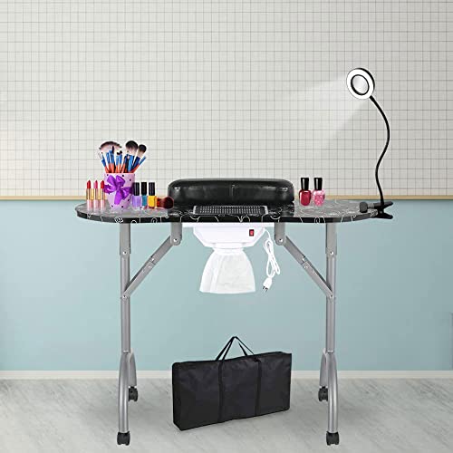 LEIBOU 35''L Portable & Foldable Vented Beauty Manicure Table Nail Technician Desk Workstation Salon Spa with Magnifier USB LED Lamp,Fan dust Collector,Sponge,Carrying Bag (Black Flower)