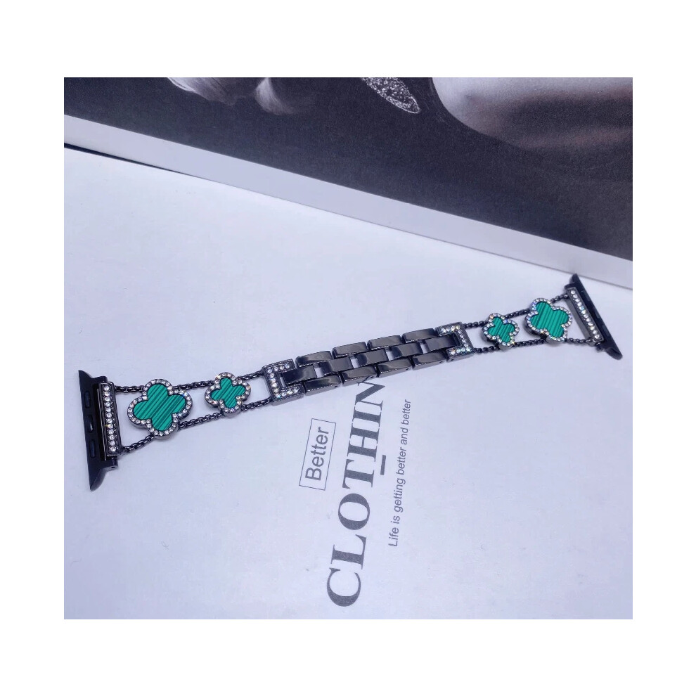 (Black+Green, 38/40/41MM) For i Watch1-8 Fashionable Diamond Inlaid Four-Leaf Clover Metal Watch Strap Hot
