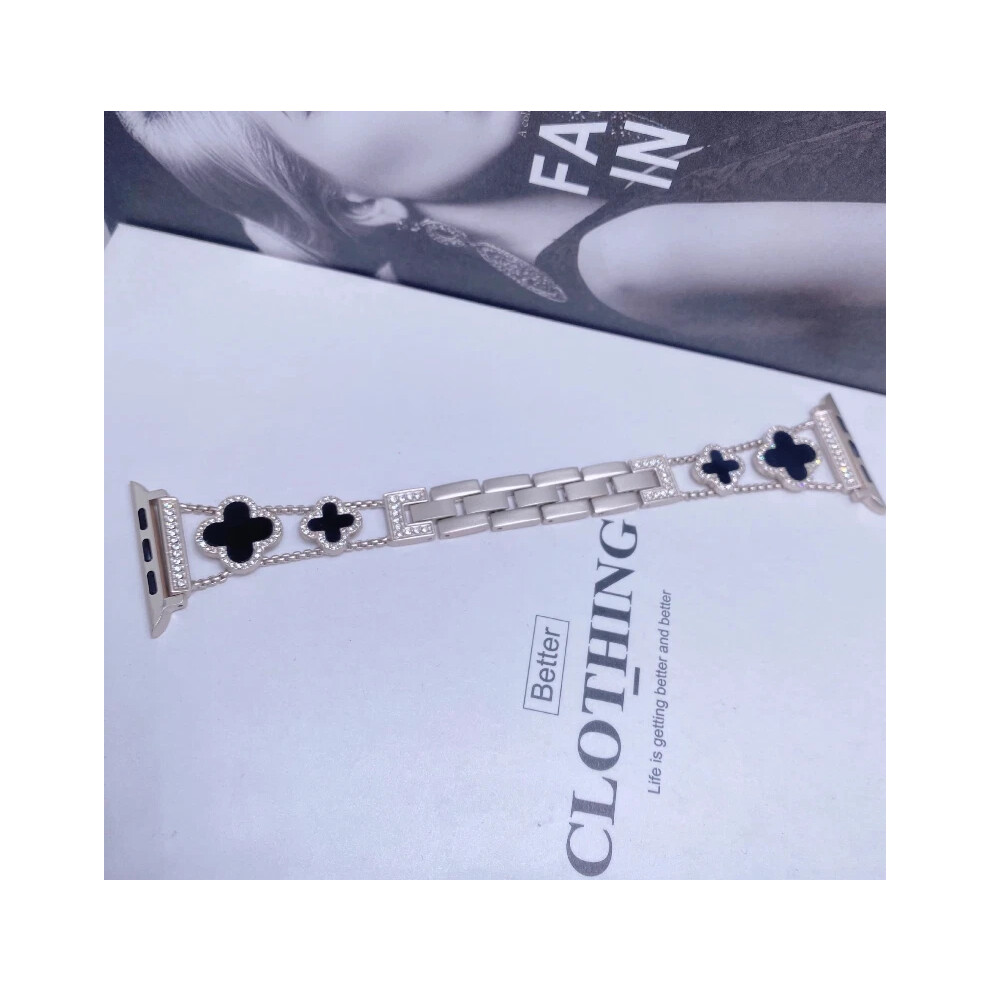 (Starlight color+black, 42/44/45MM) For i Watch1-8 Fashionable Diamond Inlaid Four-Leaf Clover Metal Watch Strap Hot