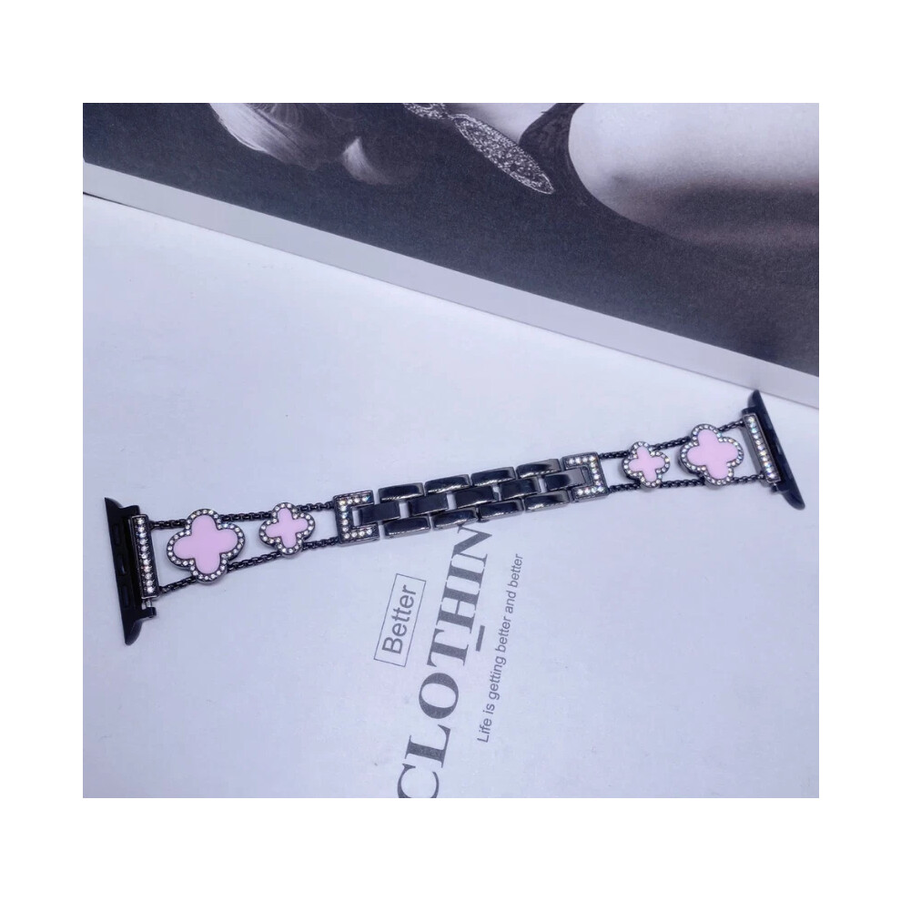 (Black+Pink, 38/40/41MM) For i Watch1-8 Fashionable Diamond Inlaid Four-Leaf Clover Metal Watch Strap Hot