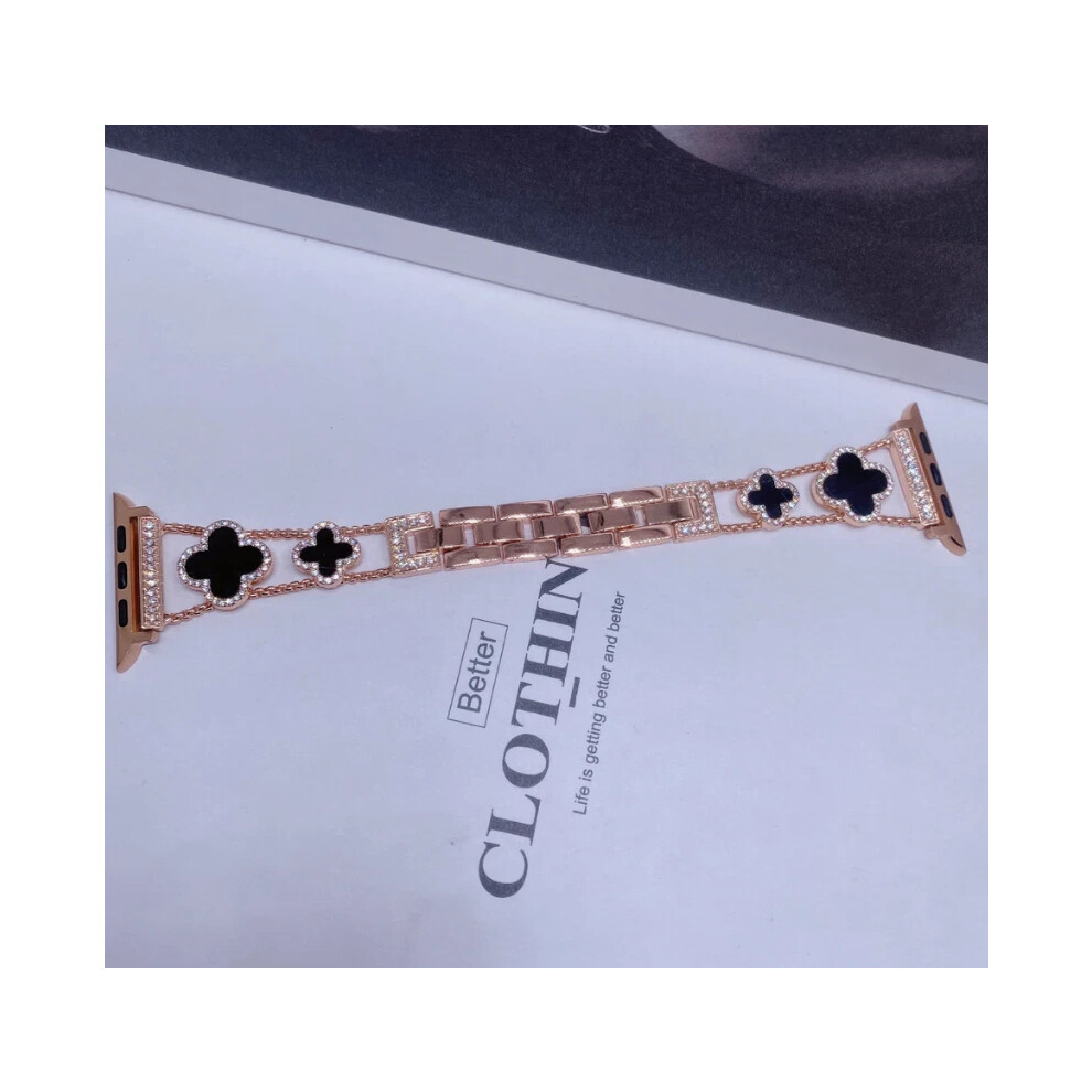 (Rose Gold+Black, 38/40/41MM) For i Watch1-8 Fashionable Diamond Inlaid Four-Leaf Clover Metal Watch Strap Hot
