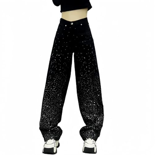 OATTIS Diamond Black Casual Jeans For Women In Autumn,high Waist,loose Fit,slimming Straight Leg,wide Leg, Floor Length Pants,Color1,L