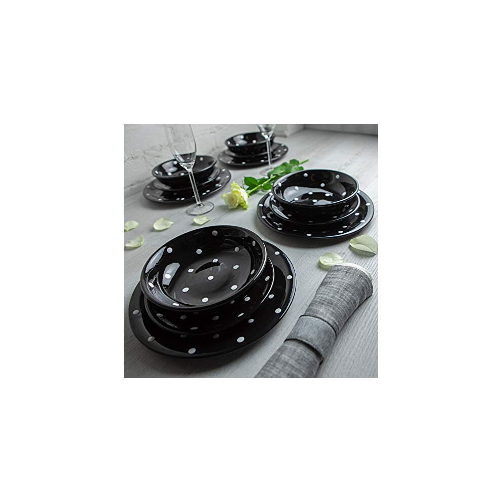 City to Cottage? Black and White Handmade Hand Painted Ceramic 12 Piece Tableware Set | Polka Dot Spotty Dinnerware Service for 4 | Dinner Plates |