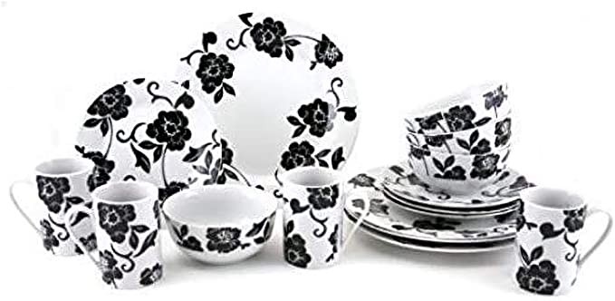 16PC Dinner Set Bowl Plate Mug Soup Side Porcelain Cup Gift Kitchen Service New (Black Patterns)