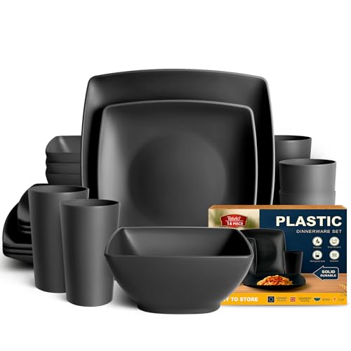 Teivio 16-Piece Kitchen Reusable Plastic Square Dinner Set, Service for 4, Dinner Plate, Dessert Plate, Cereal Bowl, 13.5 oz Cup, Unbreakable Plastic Plate and Bowl Set, Outdoor Camping Dishes, Black