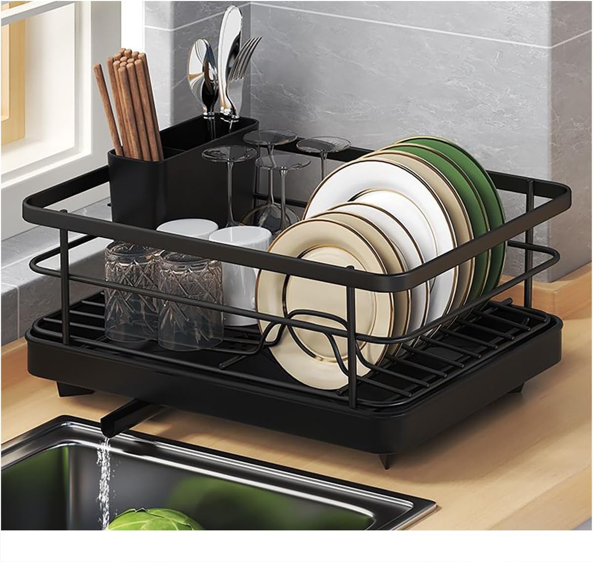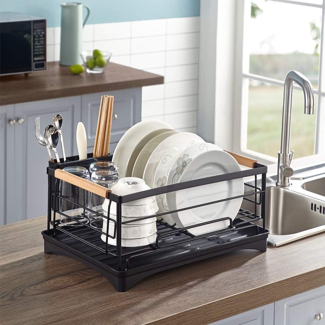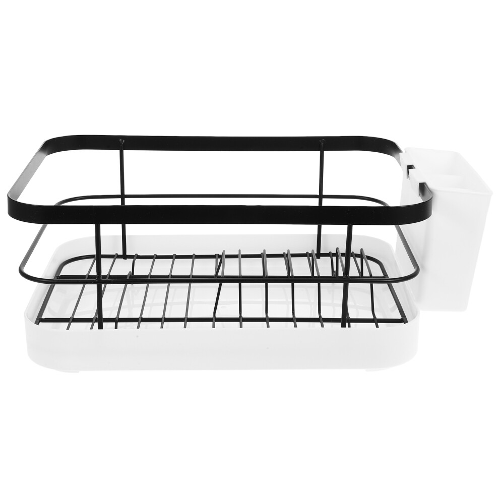 Black Steel Dish Drainer Rack with Drip Tray Cutlery Holder Plate Rack Kitchen Sink