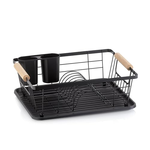Vinsani Deluxe Dish Drainer Drying Rack with Wooden Handles Drip Tray Draining Board and Removable Cutlery Holder, Minimalist Dish Rack, 42.5 x 30.5 x 14cm (Black)
