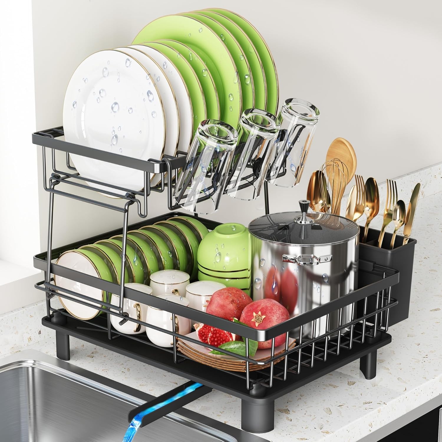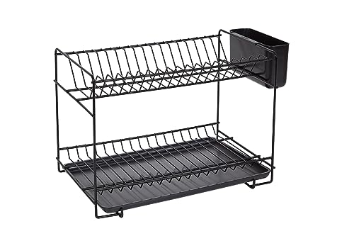 2 Tier Black Dish Drainer Rack with Drip Tray & Utensils Holder by DYZI