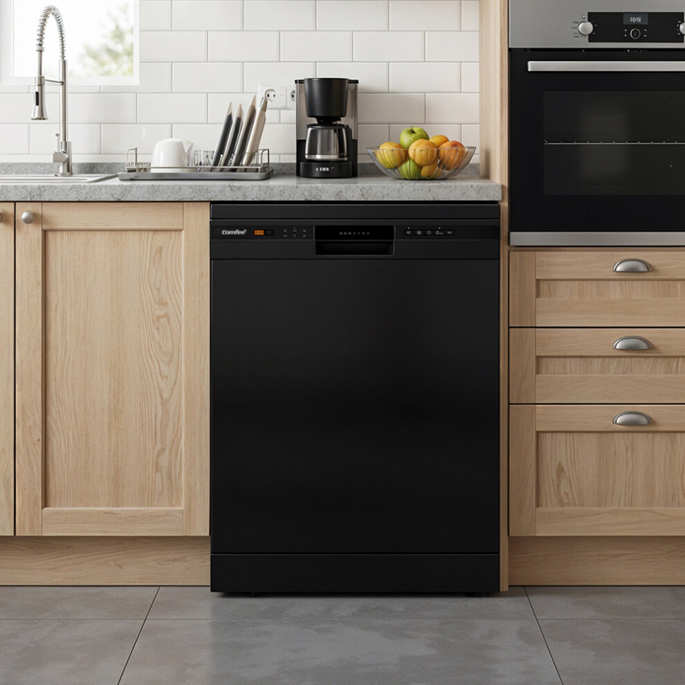 COMFEE' Freestanding Dishwasher CDWEF1435EBC-UK with 14 place settings, Full Size, Whisper Quiet 44dB, Wide LED Display, Delay Start, Half Load Function, Flexible Racks, Black