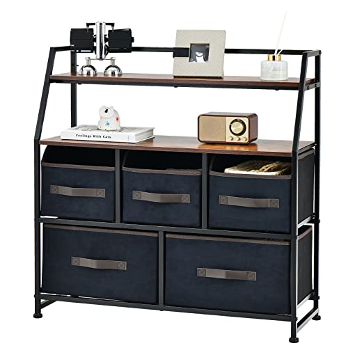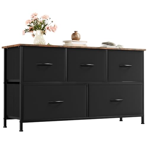 YITAHOME Chest of Drawer Bedroom with 5 Drawers Storage Unit Steel Frame Wood Top Fabric Dresser for Bedroom Living room,Closet,Black wood grain