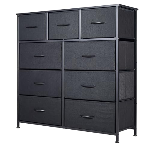 Panana Fabric Chest of Drawer, Tall Dresser Storage Drawer with 9 Drawers Bins for Closet - Steel Frame, Wood Top Organizer for Bedroom, Kids room, Living room, Closet (Black)