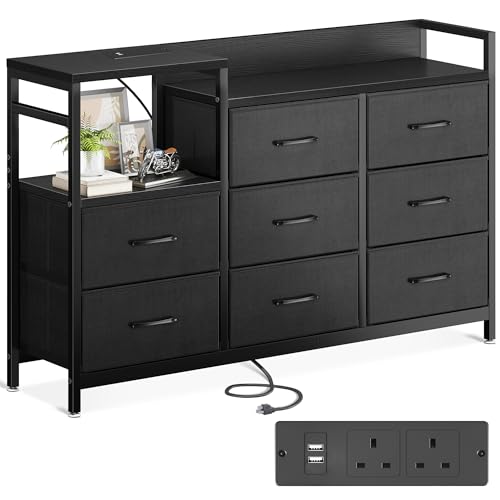ODK Black Chest of Drawers Bedroom, Contains 2 USB & 2 AC Ports Sockets, Storage Dresser with 8 Fabric Drawers Suitable for Bedrooms, Living Rooms