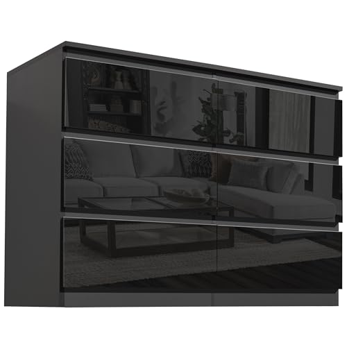 Panana 3/4/5/6 Drawer Dresser with High-Gloss Drawer Fronts and Matte Finish Sides, Wooden Chest of Drawers Bedside Table Storage Organizer Unit Nightstand for Home Office (Black, 6 Drawers)