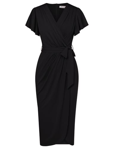 GRACE KARIN Ladies Summer Dresses Short Sleeve V Neck Faux Wrap Dress with Belt Women’s Casual Semi Formal Funeral Dress S Black