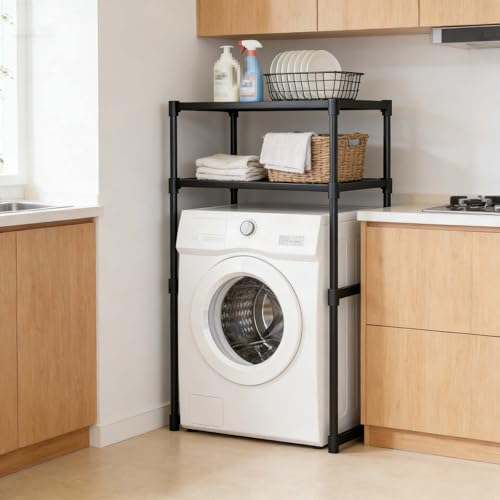 kumamart 2-Tier Adjustable Washing Machine Storage Rack - Over Washer and Dryer Shelves, Over Washer Shelf - Space-Saving Toilet & Laundry Organizer in Black/White(Black)