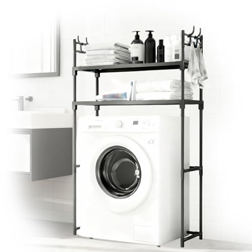 kumamart 2-Tier Over the Washer and Dryer Storage Shelf, Portable Washing Machine Storage Rack with Hooks for Bathroom & Laundry Room(Black)